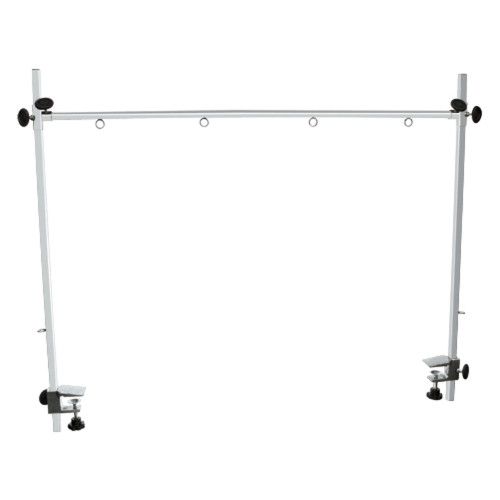 Brazo doble para mesa de peluquería: • Realizado en acero inoxidable • Se ajusta a la mesa mediante mordaza, con apertura máxima de 32 mm • Muy robusto • Con 4 puntos de fijación superior y 2 ganchos laterales para colgar máquinas o tijeras • Apertura máxima: 120 cm • Altura máxima: 100 cm, ajustable