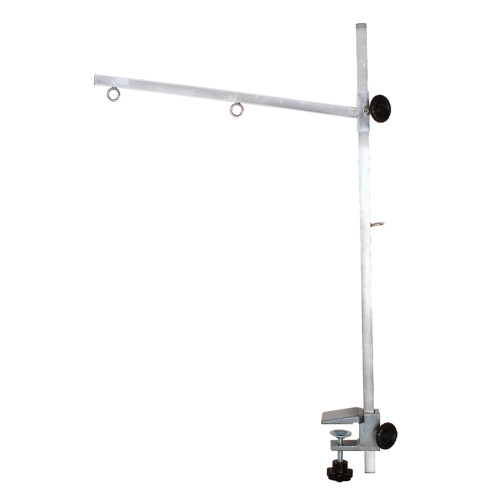 Brazo sencillo para mesa de peluquería: • Realizado en acero inoxidable • Se ajusta a la mesa mediante mordaza, con apertura máxima de 32 mm • Muy robusto • Con 2 puntos de fijación superior y un gancho lateral para colgar la máquina o tijeras • Longitud del brazo: 60 cm • Altura máxima: 90 cm, ajustable