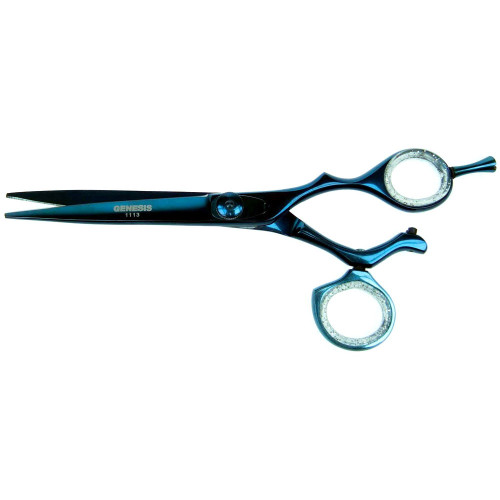 Tijera Premium Confort Titanio: • Recta • Size: 6 1/2" • Medida: 16,5 cm • Peso: 72 g • Fabricada en titanium azul • Corte navaja y afilado cóncavo • Tornillo ajustable para la tensión • Dedal de caucho extraíble • Con silenciador • Dedal giratorio para el pulgar que permite una posición correcta de la muñeca y de los dedos, en cualquier posición de corte • Ergonómica