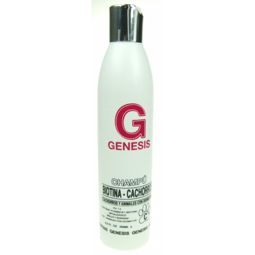 Champú Genesis con biotina: • Especial para cachorros y animales con dermatitis • Favorece el crecimiento, la vitalidad y la salud del pelo • Acelera la recuperación de los problemas de dermatitis en la piel • Con su uso se puede prescindir de acondicionadores y mascarillas • Perfume de coco • Ph 7,2 • Concentrado, admite una disolución de 1/3 • Envase de 250 ml