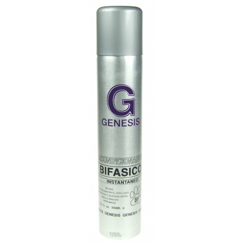 Acondicionador Genesis: • Bifásico, instantáneo • Producto de mantenimiento para el corte y cepillado del manto del animal, al que proporciona elasticidad y protección • Evita la aparición de nudos y de electricidad estática con el cepillado • Para todas las razas, pero en especial para razas de pelo largo o medio, con subpelo • Perfume frutal • En spray sin gas • Envase de aluminio de 300 ml