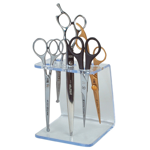 Soporte de sobremesa para tijeras: • Realizado en metacrilato transparente • Para 5 tijeras • Medidas: fondo 12 cm, ancho 11 cm, altura 13 cm