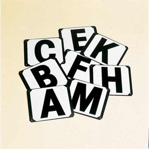 Juego de 8 letras: ABCEFHKM. Para fijar en paredes o vallas. Cada letra dispone de 4 agujeros, uno en cada esquina. Medidas: 20x24 cm.