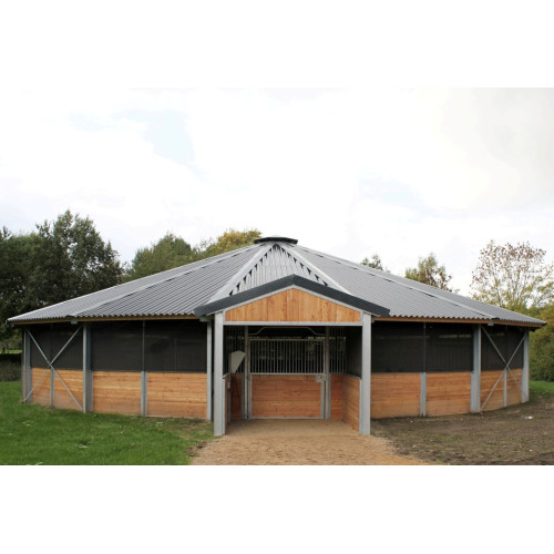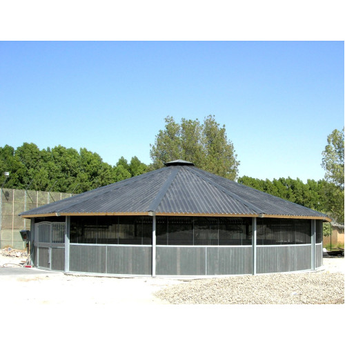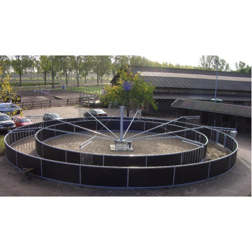 Pantallas divisorias ajustables completamente electrificadas (incluido pastor eléctrico), en caminadores de hasta 16 m. de diámetro las pantallas van equipadas con 10 barras de aluminio de 1500 mm. y a partir de 16 m. la torre central es de mayor altura y las pantallas son de 14 barras de aluminio.