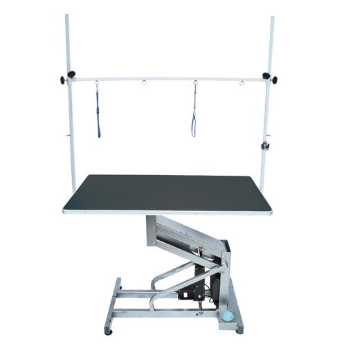 Mesa eléctrica Genesis Basic: • Permite la preparación del perro, de cualquier raza • Tablero de 55 x 105 cm, recubierto de una superficie de caucho antideslizante • La peana en forma de H garantiza una mayor estabilidad cuando se trabaja con animales nerviosos • Incluye un brazo puente doble, de acero inoxidable, ajustable en anchura y altura, con 2 ganchos laterales para colgar las esquiladoras y 3 ganchos superiores para ajustar al animal • Incluye 2 correas • Control eléctrico de la mesa accionado por el pie • Variación de altura de 47 cm: altura mínima 50 cm, altura máxima 97 cm