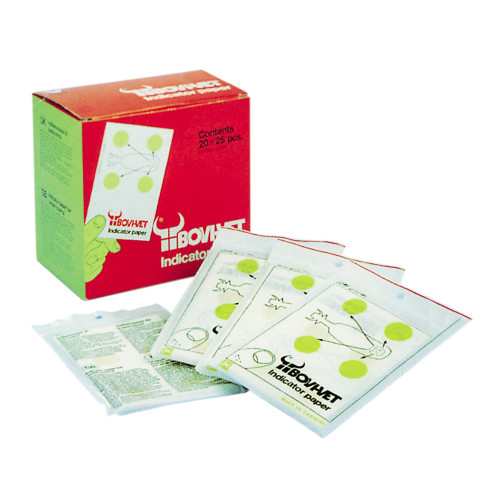 Papel detector de mamitis: • Unas gotas de leche de cada pezón sobre los círculos, determinan los pezones infectados, debido a la mayor acidez de la leche. • En caso de test positivo el color del papel indicador cambia de amarillo a verde. • Paquete de 25 unidades.