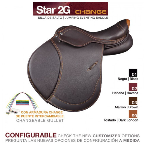 Por ejemplo, el modelo Star 2G CHANGE de la fotografía está fabricada en cuero marrón con el vivo, el hilo y el adorno de la cola tostado y el burlete en color marrón y configurada con la armadura CHANGE, el asiento extraconfortable (ver coste añadido ref. 00902), la opción de baste anatómico (ver coste añadido ref. 00903), baste rellenable multiposición (ver coste añadido ref. 00916) y latiguillos cortos y multiposición de salto (ver coste añadido ref. 00915).