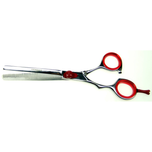 Tijera Genesis de esculpir para zurdos: • Con 1 hoja dentada con 30 dientes • Size 6 1/2" • Medida: 16,5 cm • Peso: 68 g • Acero japones con excelente suavidad y precisión de corte • Tornillo de tensión de corte, ajustable por cojinete de bolas, para reducir las fricciones • Dedal de caucho extraíble, con silenciador • Ergonómica